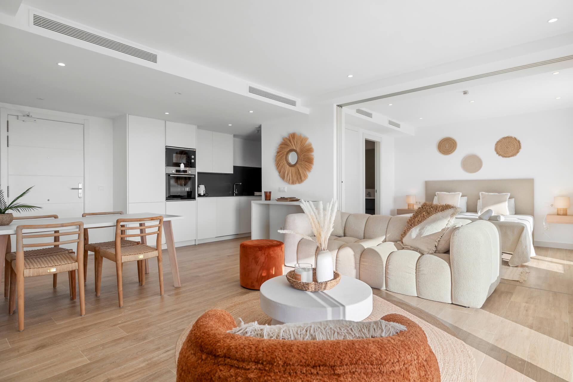 The living area flows seamlessly into a spacious 25 m² terrace, where the indoors and outdoors blend effortlessly. A place to relax, dine, or simply enjoy the view and the Mediterranean climate.
