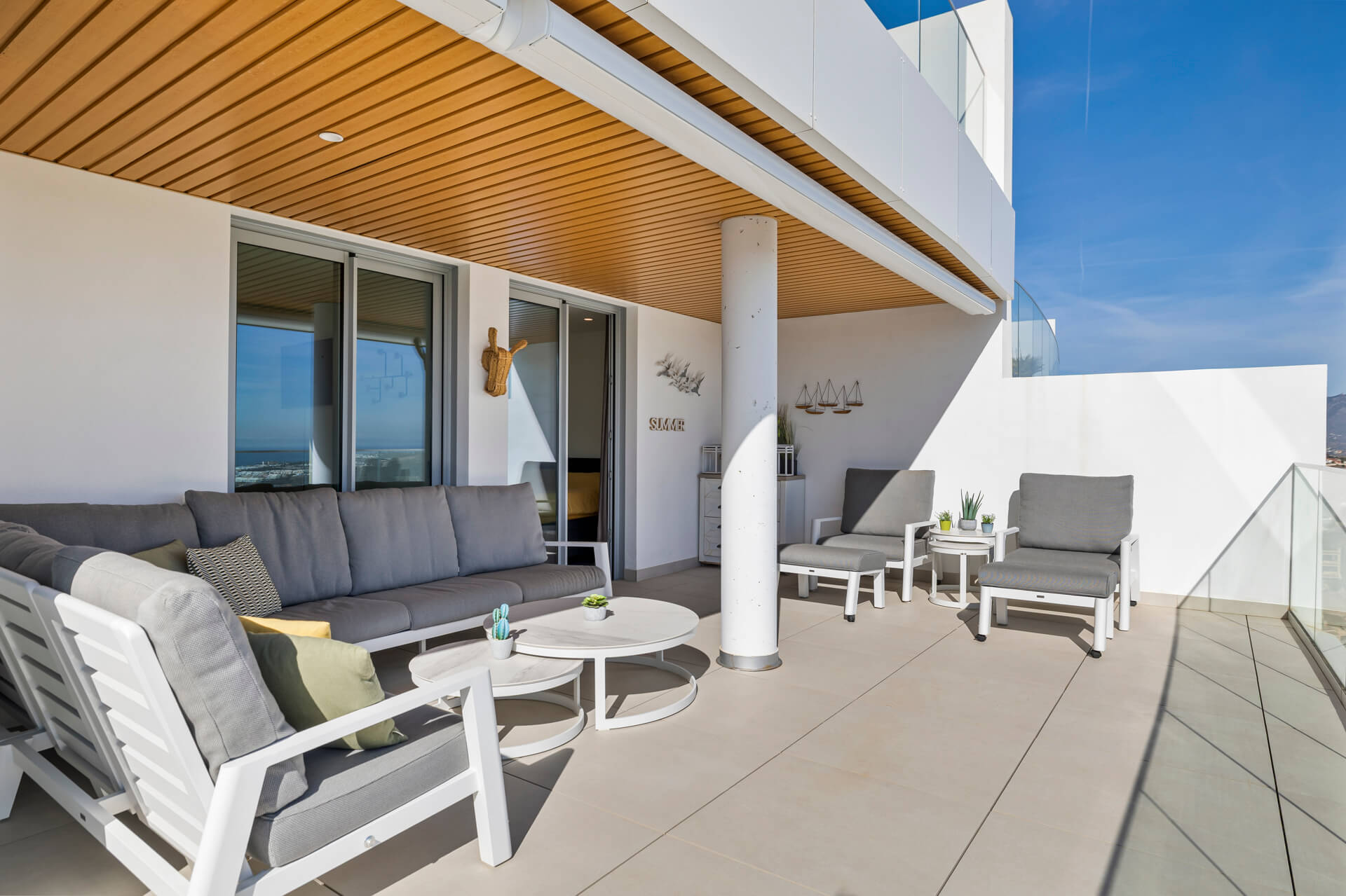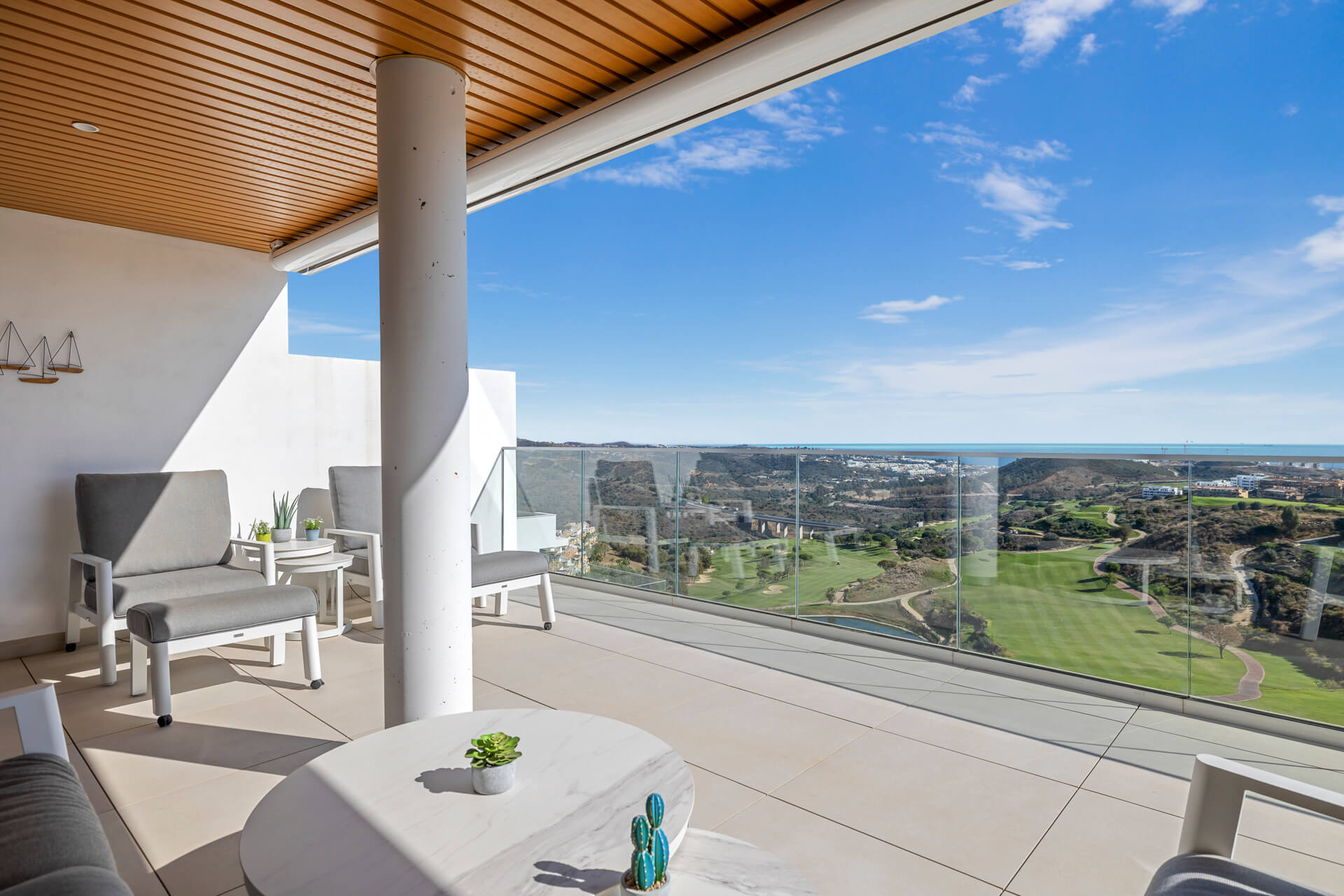 The spacious terrace, measuring approximately 40 m², serves as an extension of the living room: ideal for lounging, dining, or simply enjoying the panoramic views of the golf course and the Mediterranean Sea.