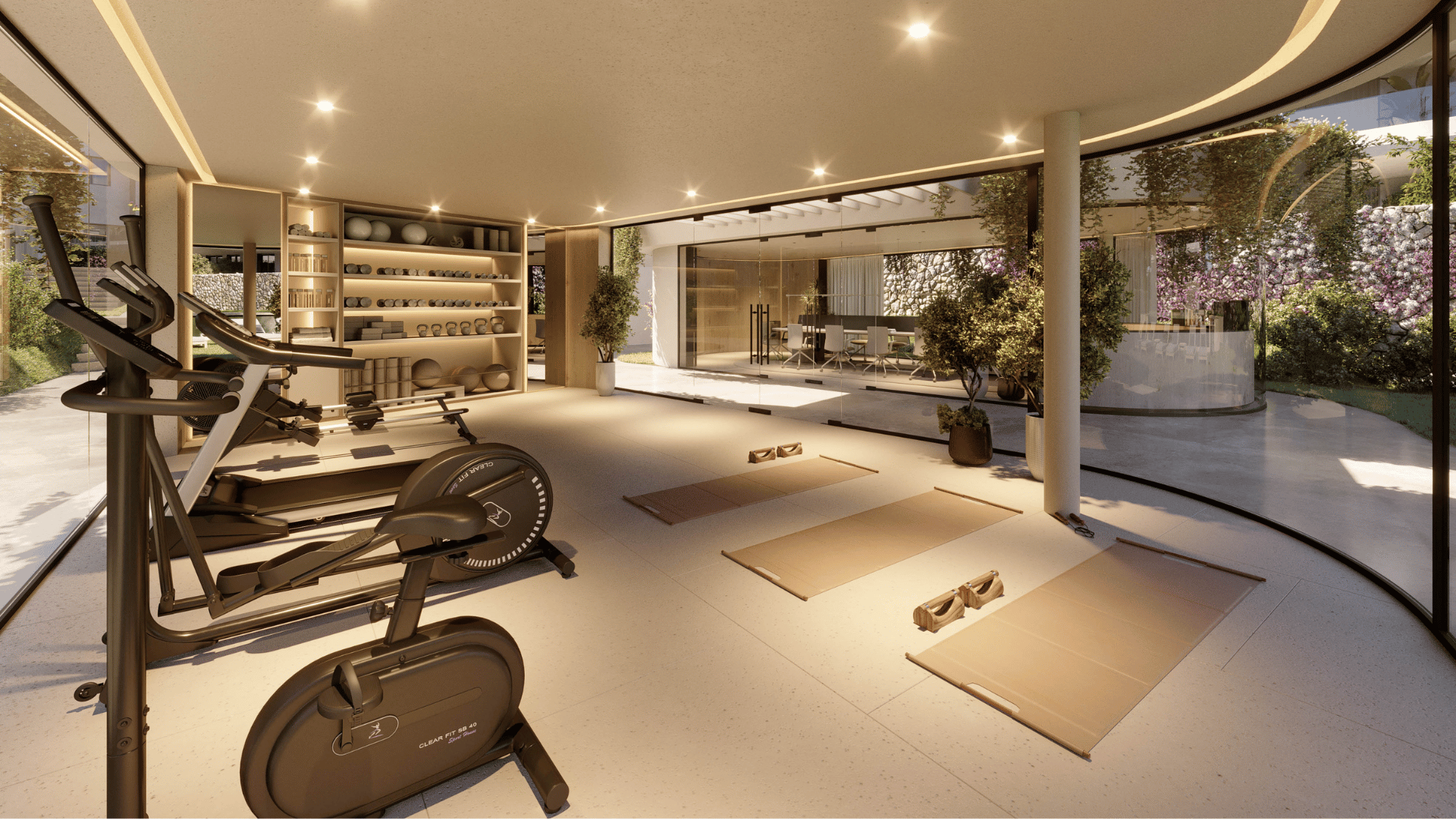 The architecture’s soft lines blend seamlessly with nature. Organically shaped terraces mirror the undulating coastline, while green roofs and meticulously landscaped gardens create a serene atmosphere. Inside, neutral tones, wood, and natural stone dominate, combined with floor-to-ceiling windows that merge the interior and exterior into a single space.